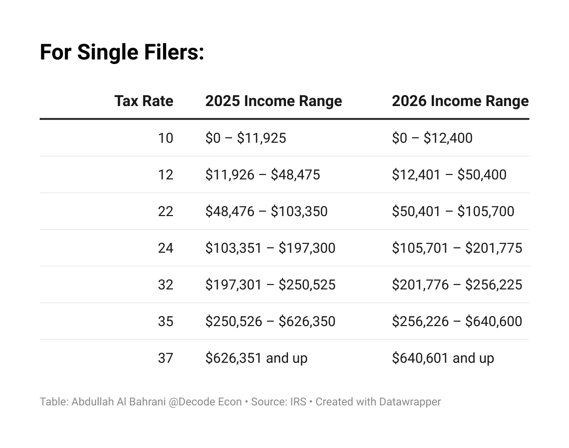 For instance, a single filer earning $50,000 will remain in the 12% bracket next year rather than moving into the 22% bracket. That shift means millions of Americans will see a smaller portion of their income taxed at higher rates in 2026.