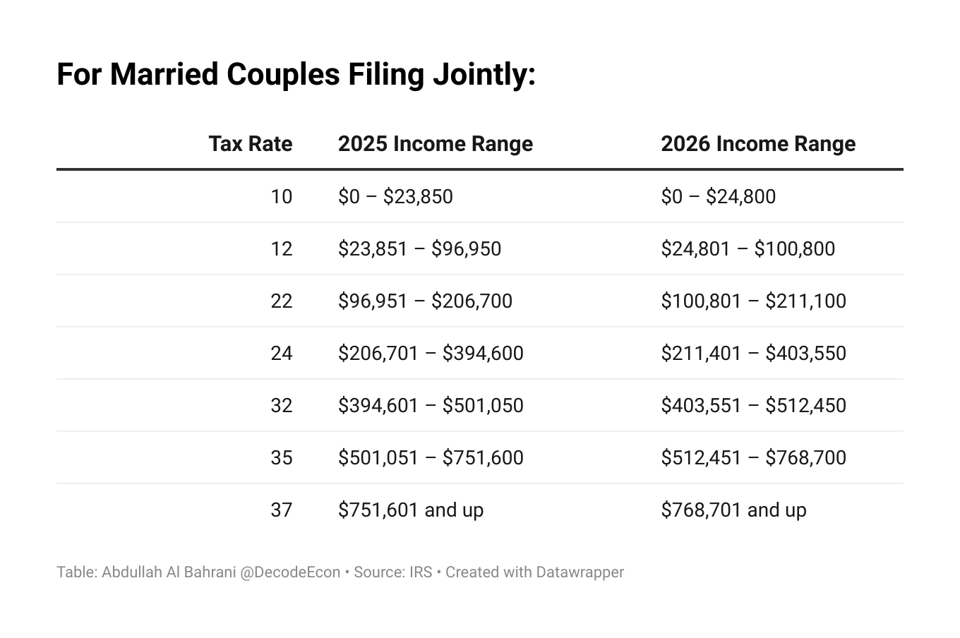 What’s happening here is that every bracket moved upward slightly, which means taxpayers can earn more before reaching the next threshold. This doesn’t change the rates themselves, but it changes how much of your income gets taxed at each level.