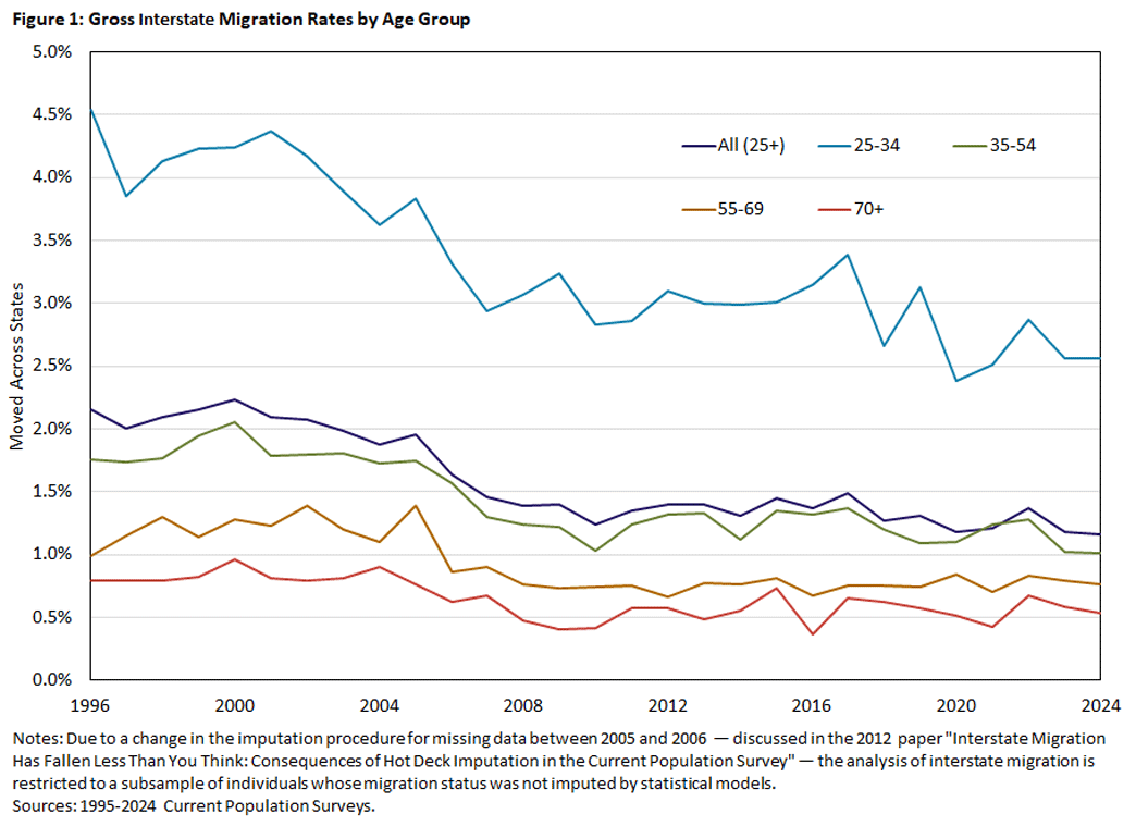 Research from the Federal Reserve Bank of Richmond indicates a steady decline in interstate migration across all age groups since the mid-1990s. Younger workers still move more than older workers, but even their mobility has fallen sharply.