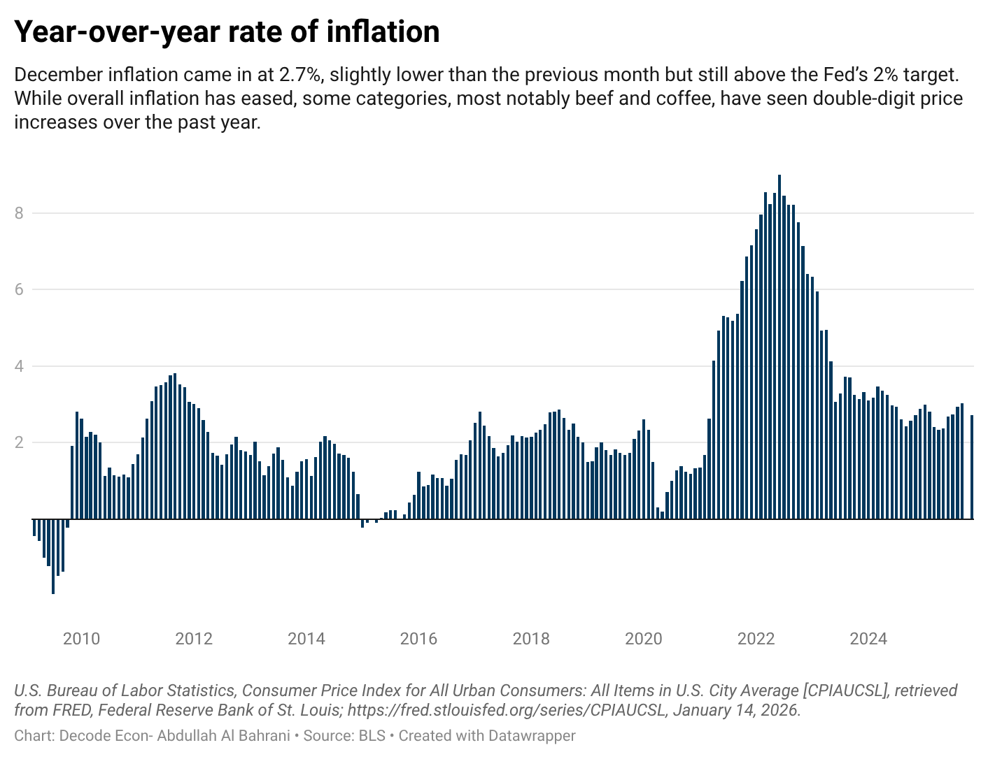 According to the Bureau of Labor Statistics, core CPI rose at a 2.6% annual rate in December, slightly below expectations. Headline inflation was 2.7%, exactly in line with forecasts. Progress, yes—but still above the Federal Reserve’s 2% target.
