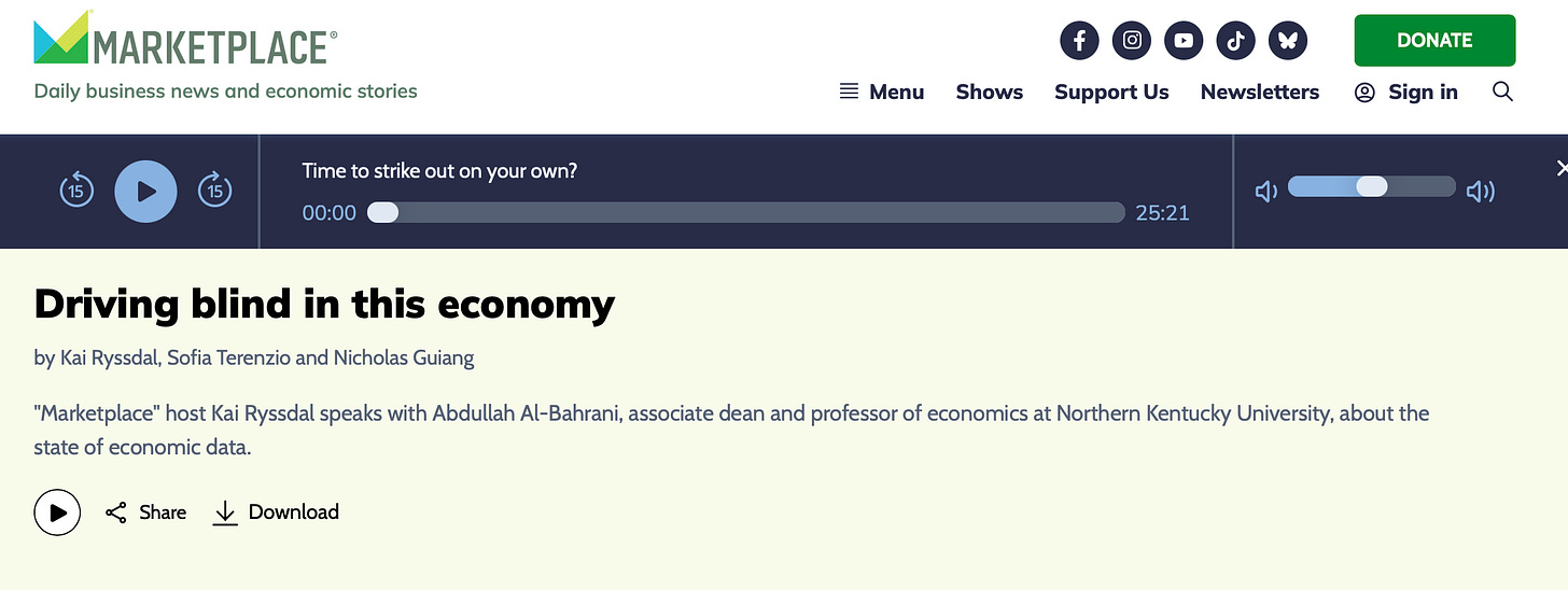 Abdullah Al-Bahrani: Well, first of all, I want to say I have a lot of friends—economists working on this and they are trustworthy individuals and they take their responsibility seriously. unfortunately, it’s not them in this situation. It’s the system, the the lack of information that has been presented, the shutdown has allowed this narrative that to develop that we cannot trust the data that’s coming to us. So, whether they’re doing a fantastic job or not, which they are, the people processing this information are not feeling as confident about it. And that reduces how effective we can communicate what the data is telling us and what we do with it after that.