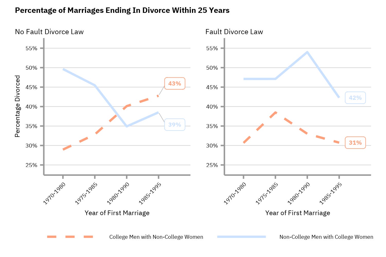 However, in the late 1960s, the U.S. began shifting from “fault” divorce laws to “no-fault” divorce laws. Under the old system, both spouses had to agree, and one often had to blame, leading couples to fake allegations. Divorce was especially hard if one spouse resisted. No-fault laws ended these issues: spouses no longer had to point fingers. In my working paper (and Substack post), I show this change made divorce easier for women without college degrees but may have discouraged college-educated women from divorcing. I am not the only one who found the pattern below.