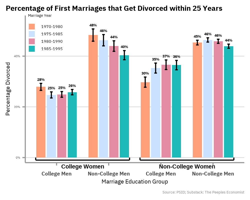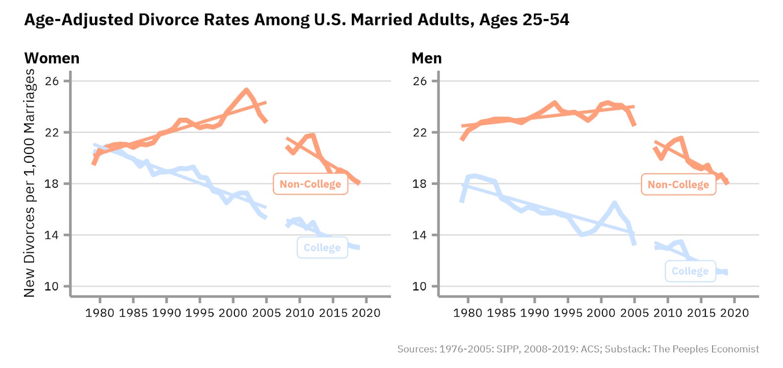 Economists and sociologists have proposed several hypotheses regarding the divorce divide: the age at first marriage is higher for adults without college degrees, birth rates have actually decreased less for college-educated adults than for non-college-educated adults in recent years, and the type of people becoming educated in 1980 is significantly different from today. I go into these potential reasons in detail in my Substack post.