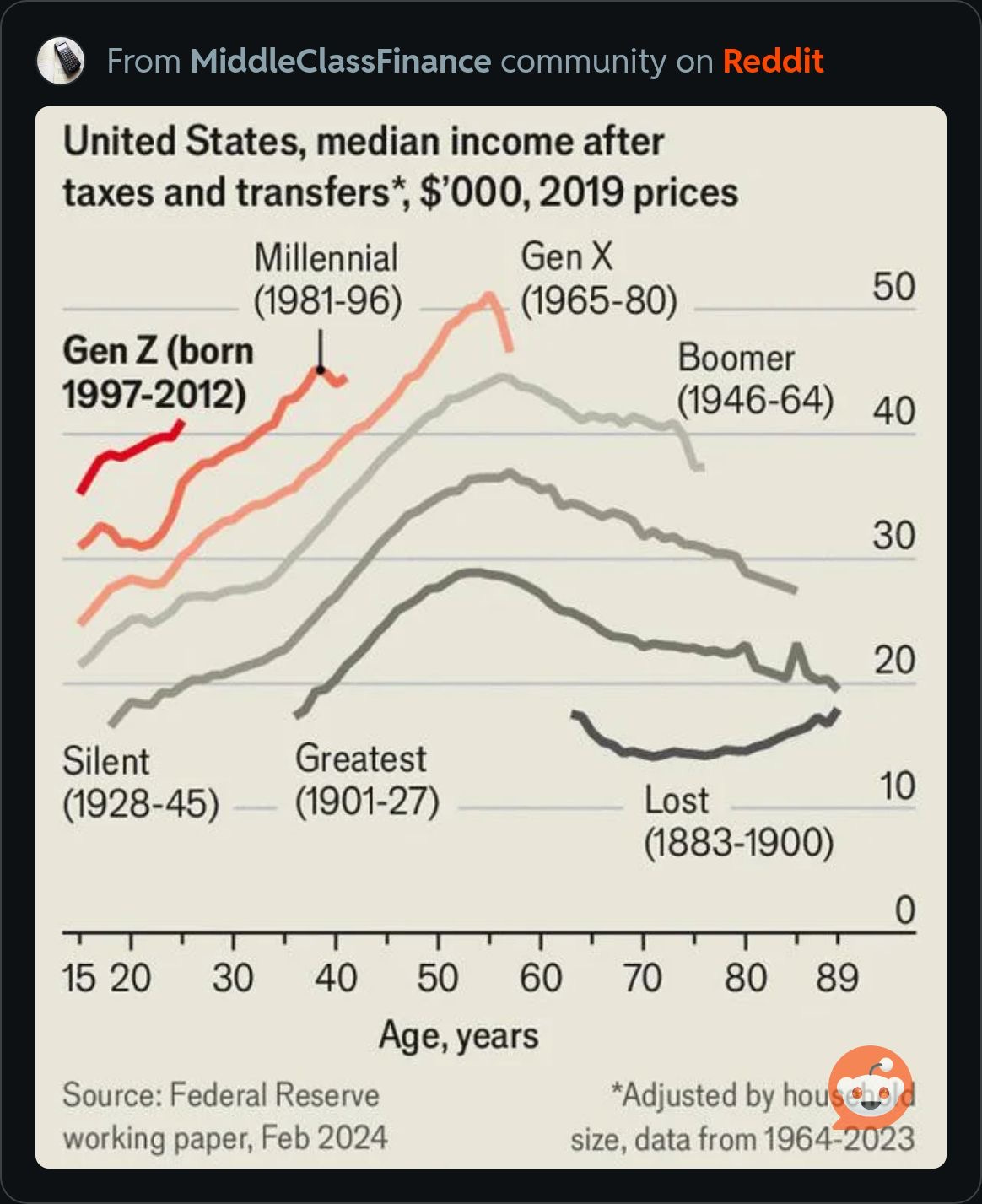 When I first saw a Reddit post claiming “Gen Z income” is higher than that of Millennials, I paused. For years, viral headlines have told us that Gen Z is worse off than any other generation. Yet this chart suggests the opposite. Is it proof that the American Dream is alive, or just a quirk of how economists measure income? Today, we’ll examine the graph and the research behind it to see if Gen Z is truly better off.