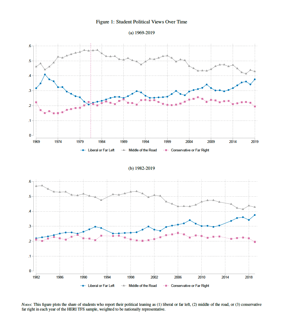 What has really changed is the decline in students calling themselves middle of the road, falling from 56.9% in 1982 to 42.9% in 2019.