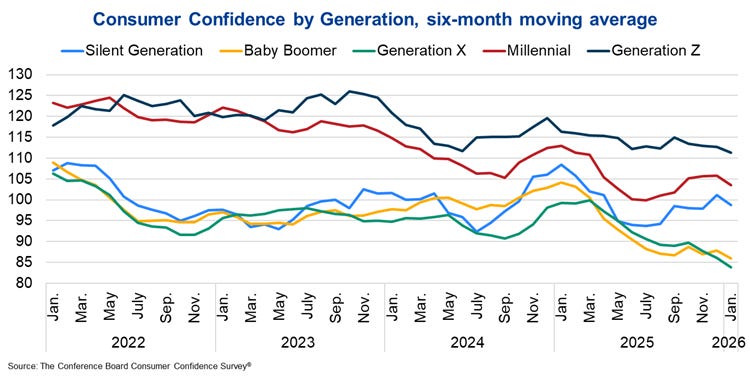 Older Americans are struggling with their economic outlook. Gen X, baby boomers, and even the Silent Generation saw much steeper drops in confidence than younger consumers. Meanwhile, Gen Z remains, somehow, the most optimistic group in the survey.