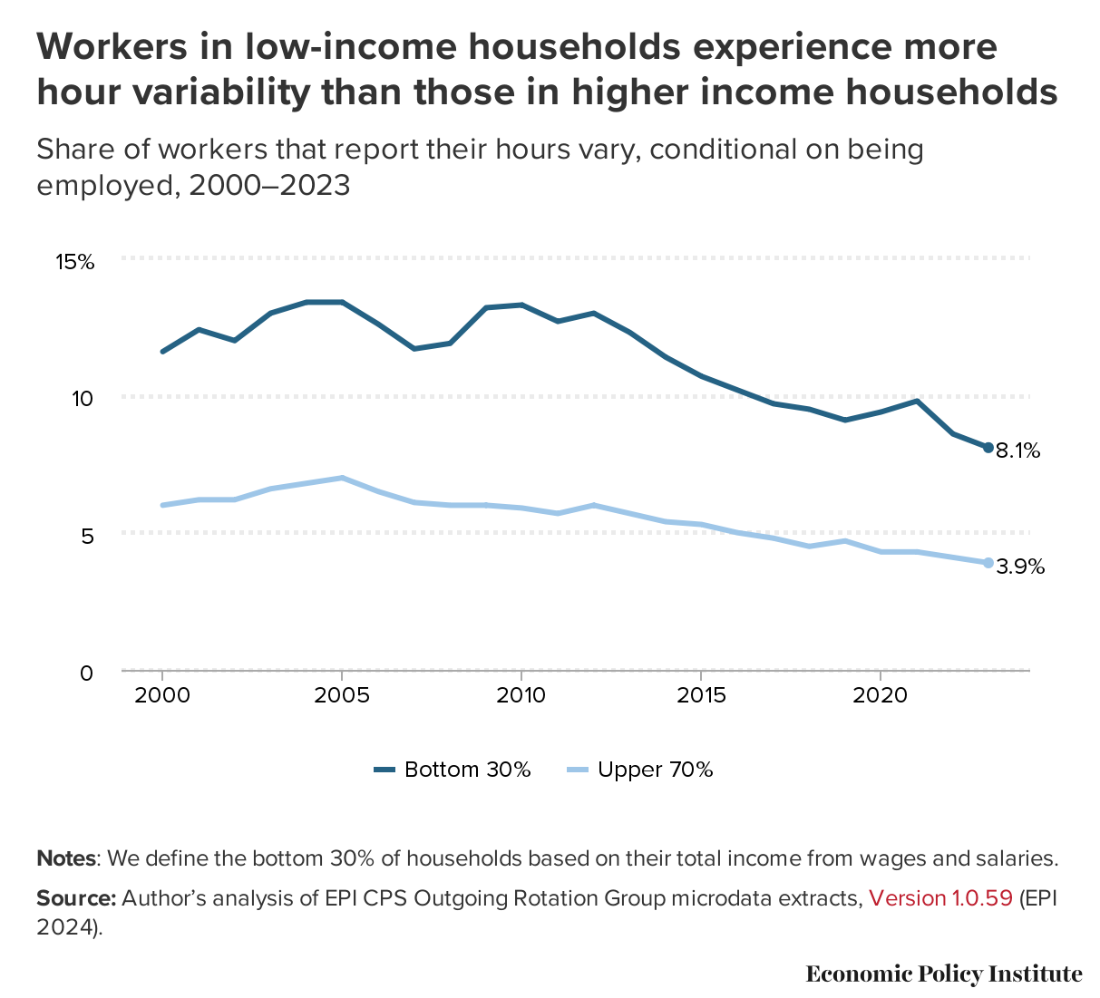 Data from the Economic Policy Institute show that households in the bottom 30 percent experience double the scheduling volatility of higher-income households. That instability makes documenting steady 20-hour weeks — the benchmark for SNAP eligibility — a daunting task even in good times and nearly impossible when the labor market softens further.