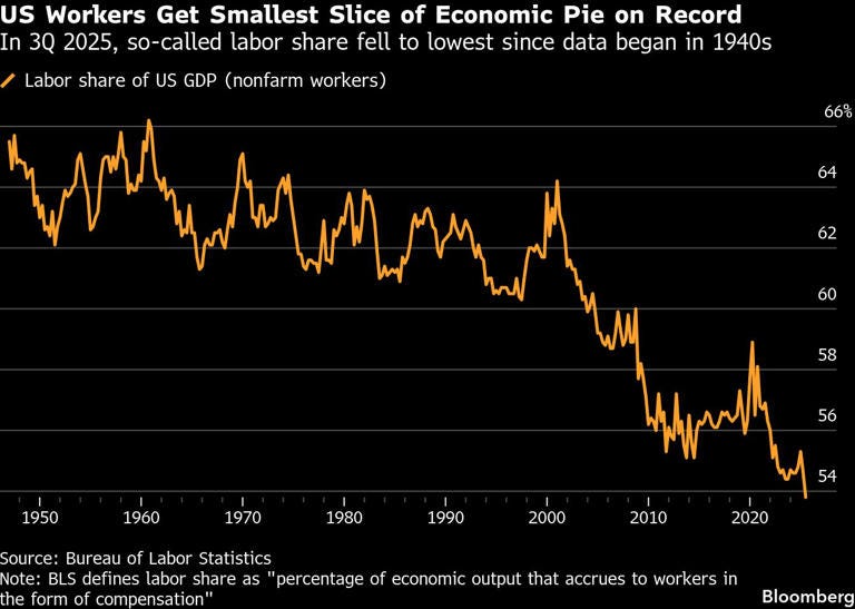 Strong growth paired with a falling labor share is a warning sign. It indicates that gains are increasingly accruing to capital rather than to wages. This may explain the K-shaped economy and contribute to increasing income inequality.