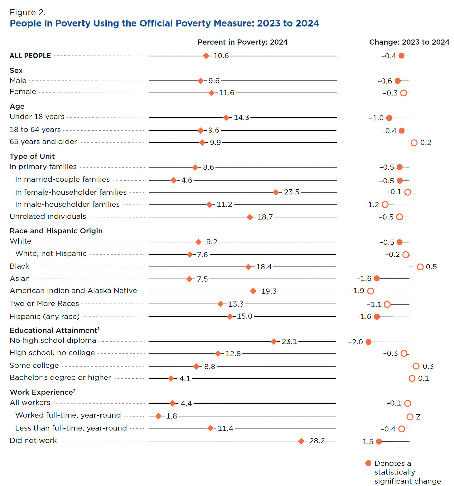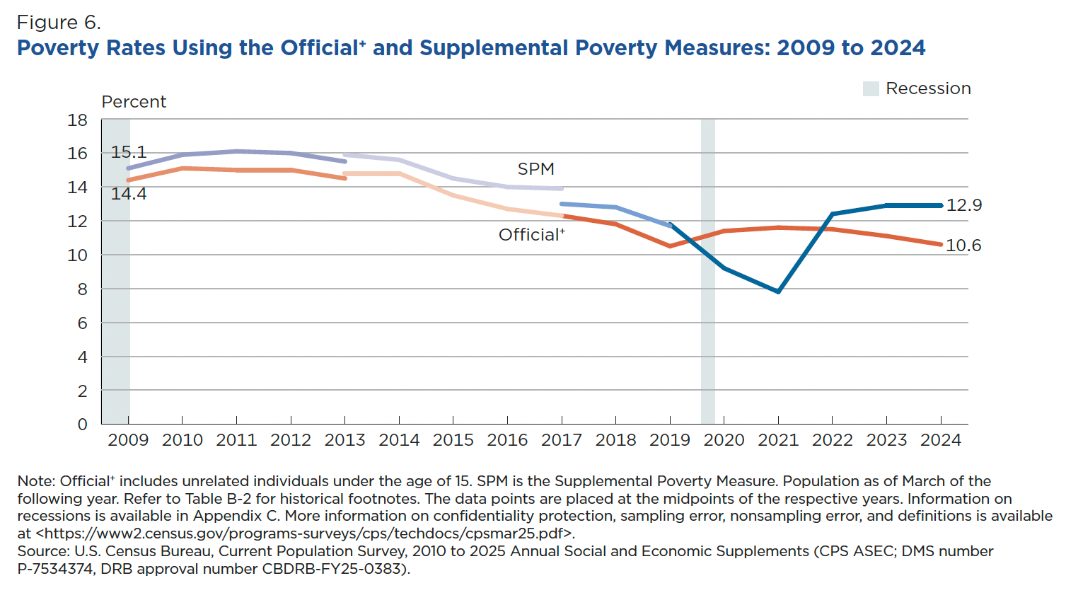 In 2024, the official poverty rate fell to 10.6%, suggesting improvement. But the Supplemental Poverty Measure (SPM) remained at 12.9%, showing no statistically significant change.