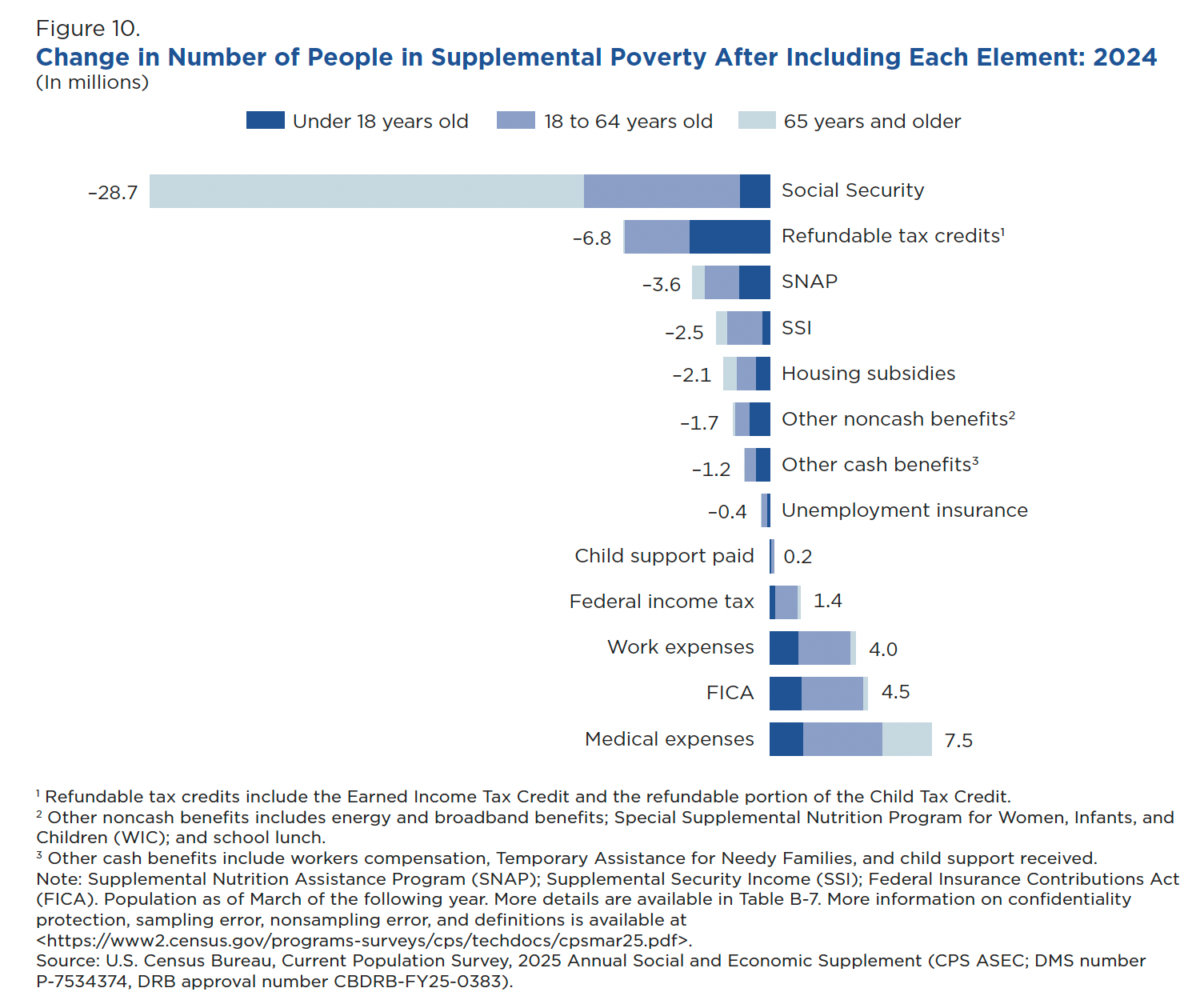 In 2024, Social Security lifted 28.7 million people out of poverty, by far the largest impact of any government program. SNAP, which is often discussed by our contributor Michael Prunka, lifted 3.6 million people out of poverty.