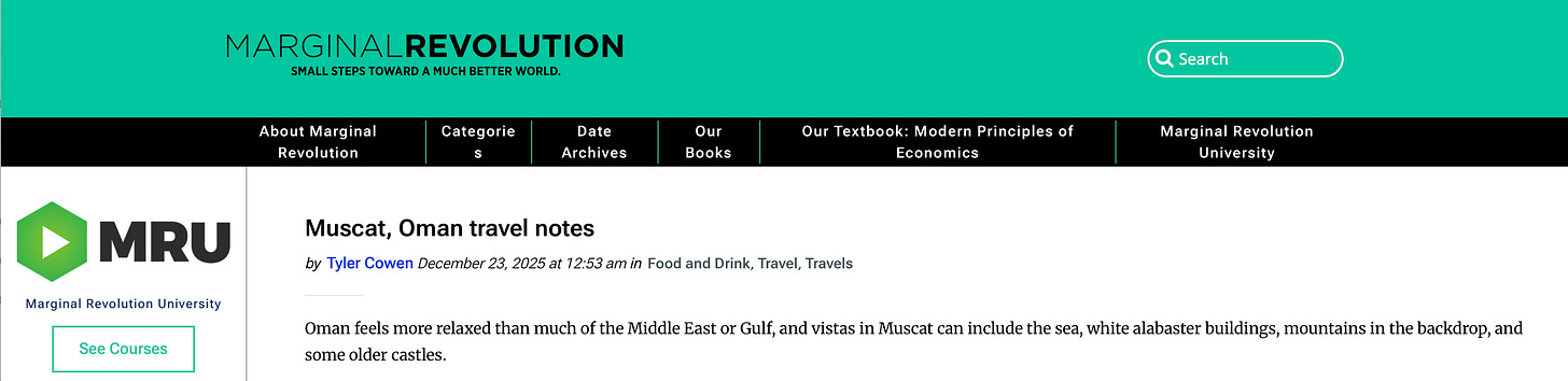 But this past week, I found myself back on Marginal Revolution, reading Tyler’s travel notes about his visit to Muscat—my hometown. The post wasn’t flashy. It wasn’t long. It wasn’t optimized. It was observant, curious, and human.