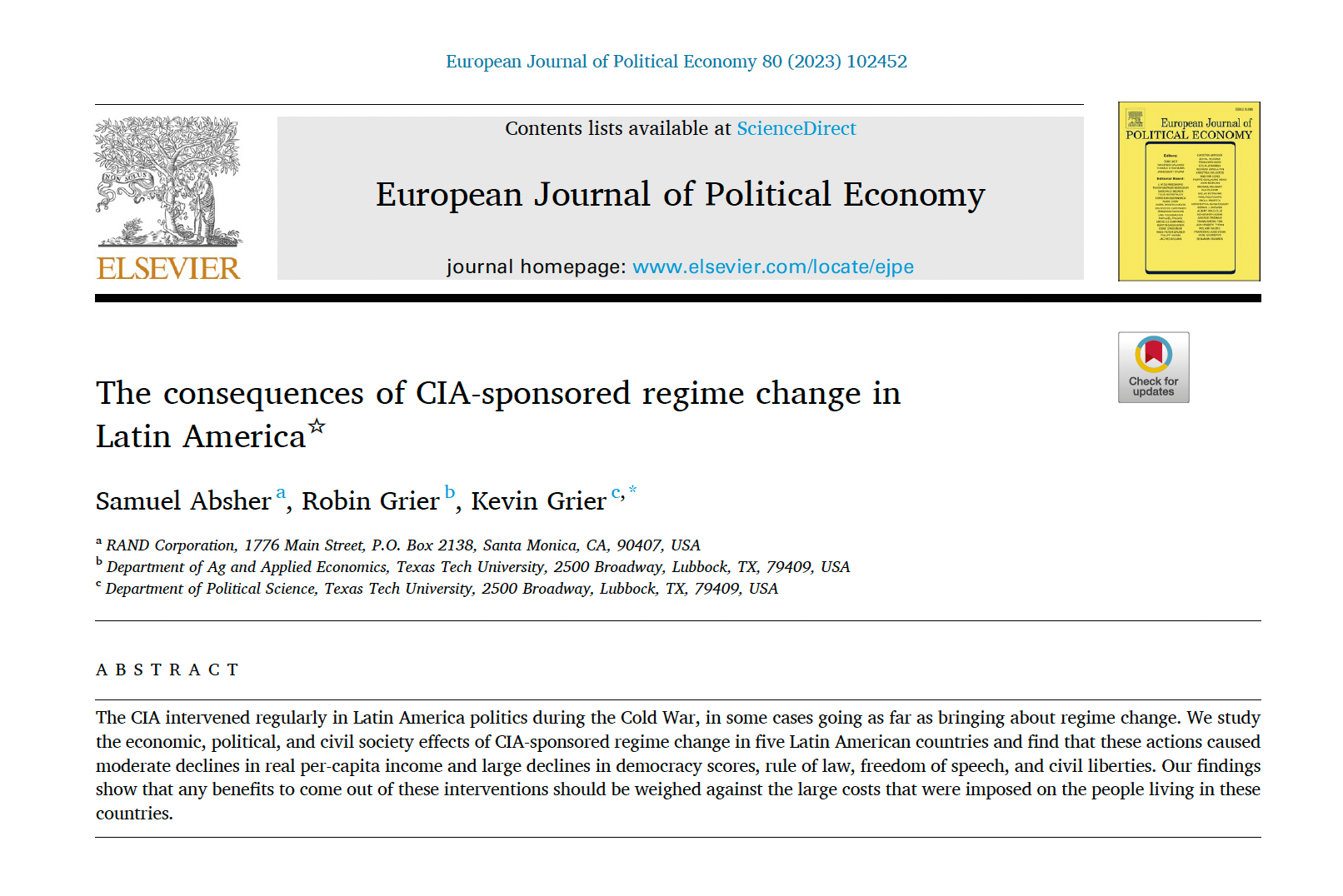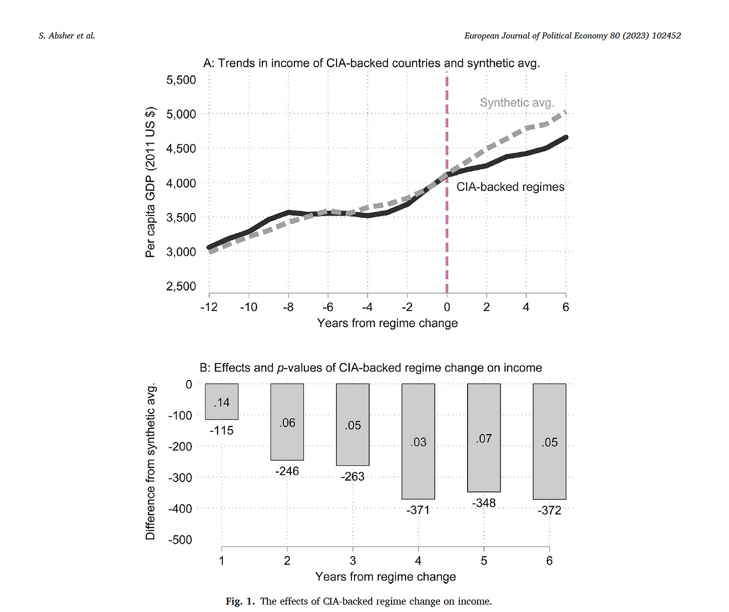 In a 2023 paper published in the European Journal of Political Economy, Absher, Grier, and Grier examine CIA-sponsored regime changes in Latin America during the Cold War. Using a synthetic control method, they compare countries that experienced U.S.-backed regime change (Bolivia, Brazil, Chile, Ecuador, and Panama) with what would likely have occurred absent the intervention.