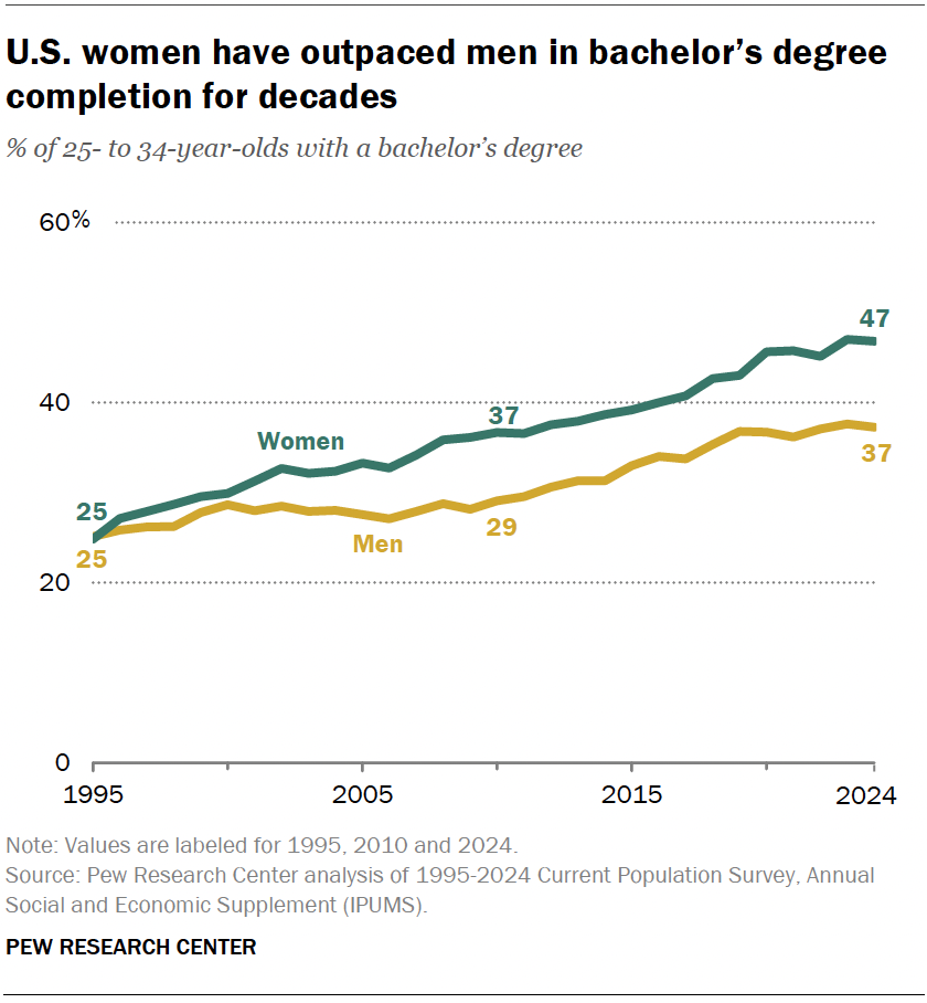 Insight into Academia reports that Women now outpace men in college completion rates. A 2024 Pew Research Center analysis finds that 37% of men aged 25 to 34 hold bachelor’s degrees or higher, compared to 47% for women. This gap has been increasing for the past four decades.