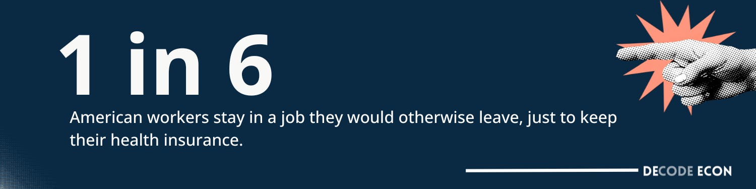 Economists call it job lock: the inability to leave a job because of benefits you cannot afford to lose. It reduces labor mobility, slows innovation, and keeps people in roles that do not match their skills. Research shows a $50 monthly drop in insurance premiums would increase the rate of new self-employment by about 9%.